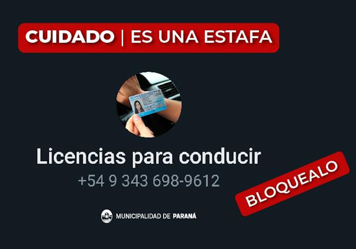 Ante esta situación, la Secretaría de Seguridad Vial, Movilidad y Ordenamiento Urbano, realizó la denuncia y advirtió a los y las paranaenses que no brinden información de ningún tipo, ya que la línea +5493436989612, cuya identificación aparece con el nombre de “Licencias para conducir”, es falsa y lo que busca es engañar y estafar a quienes reciben ese mensaje.