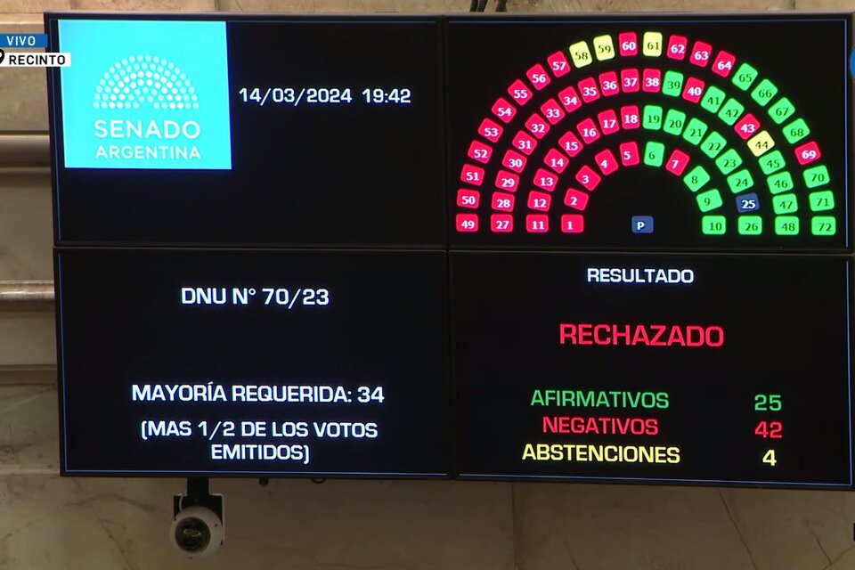 El rechazo del decreto fue aprobado por 42 votos a favor, 25 en contra y cuatro abstenciones. Además del kirchnerismo, que sentó a la totalidad de sus 33 senadores, votaron en contra los radicales Martín Lousteau (Capital), Pablo Blanco (Tierra del Fuego) y Edith Terenzi, que responde al gobernador de Chubut, Ignacio Torres (PRO).