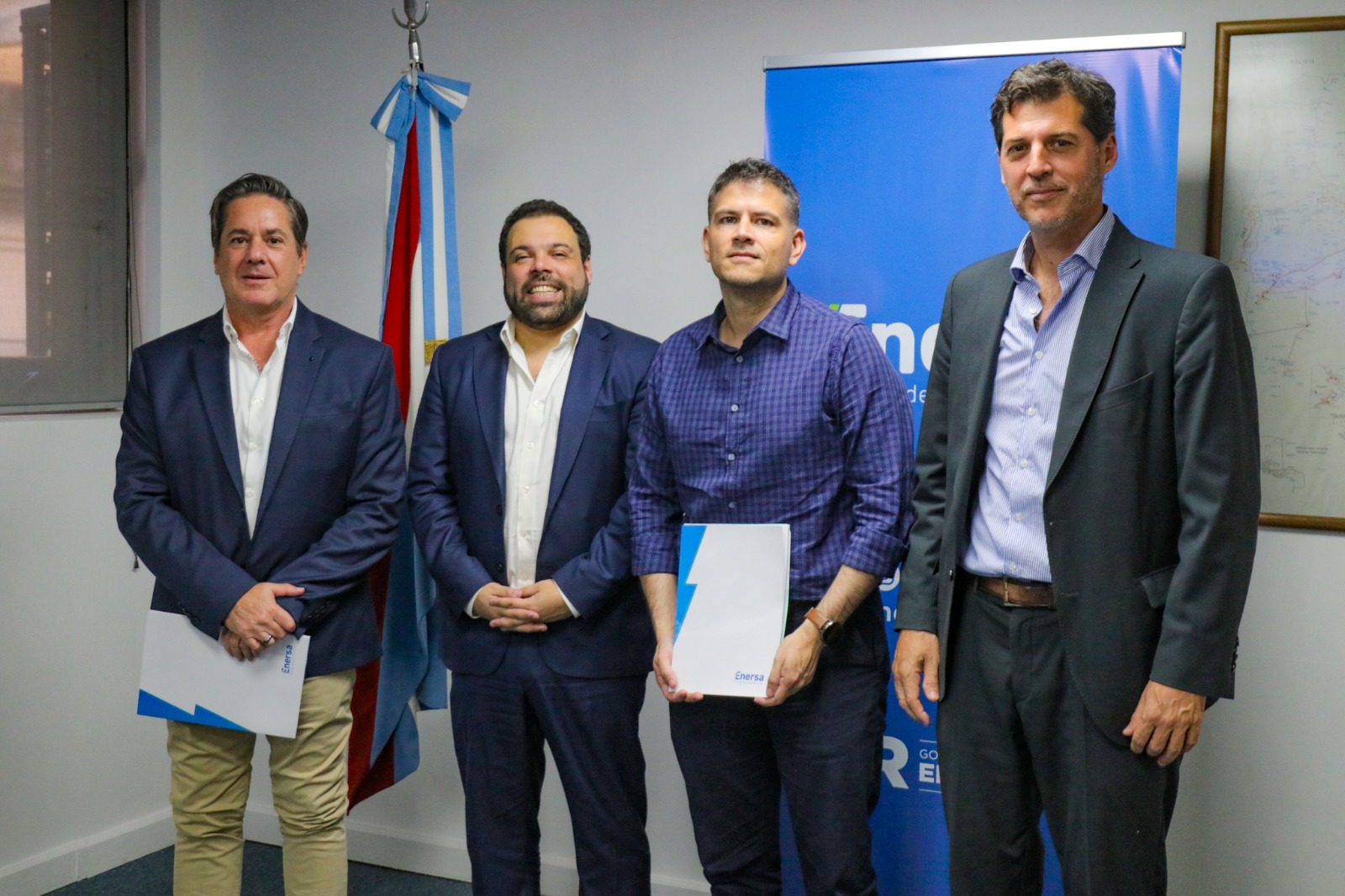 Participaron, el presidente de Enersa, Ignacio Bergallo, el ministro de Gobierno y Trabajo de Entre Ríos y vicepresidente de Enersa, Manuel Troncoso, el gerente de Asuntos Estratégicos de Enersa, Eduardo Asueta y el intendente de Feliciano, Damián Arévalo.