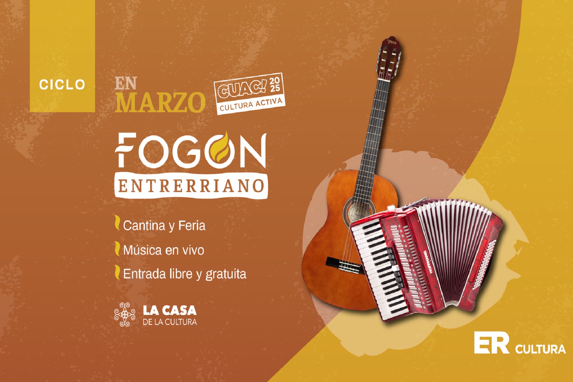 La primera fecha será este viernes 14 de marzo desde las 19 hs con feria y a las 21 hs con música en vivo, en la Casa de la Cultura (9 de Julio y Carbó, Paraná). La entrada es libre y gratuita. Se presentarán el Dúo Celia y Mario, y el Dúo Andariego.