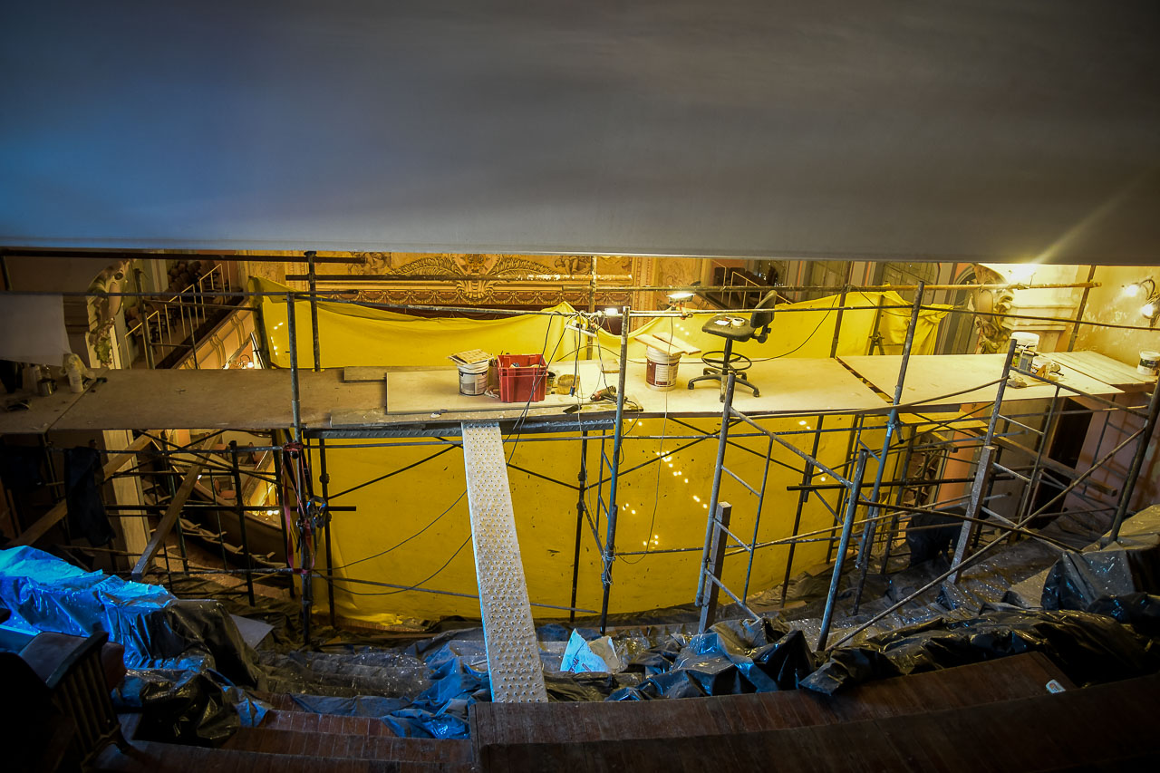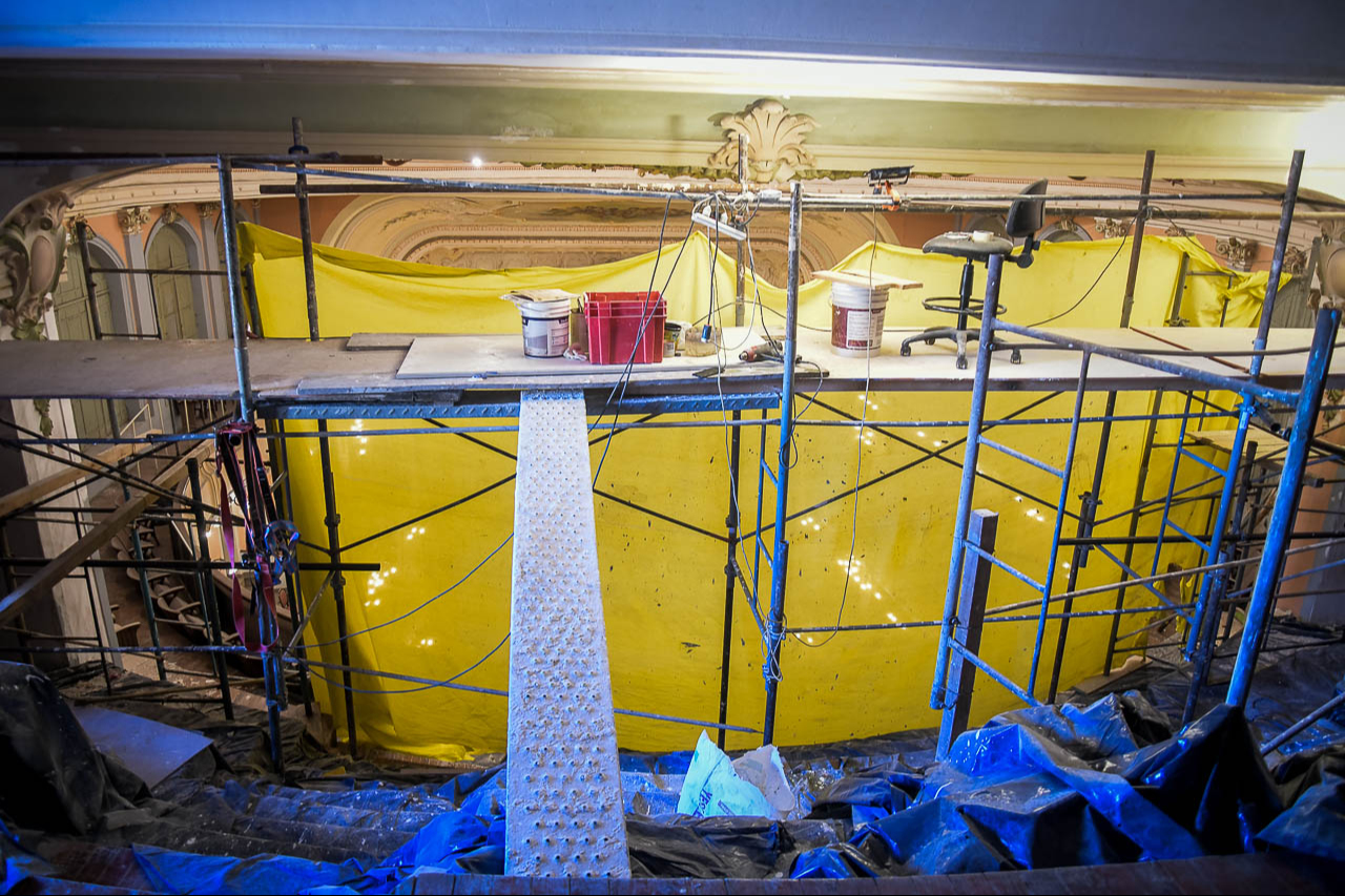La intervención se lleva a cabo con recursos municipales. Raúl González -de la empresa Art Restauro- está a cargo de los trabajos. “Se hizo la recomposición del cielo raso curvo, que había estado afectado por la entrada de humedad. Este proceso incluyó la consolidación y recuperación de la estructura. Ahora estamos en la etapa de recuperación de las pinturas artísticas, que forman parte del decorado de la sala central del teatro”, expresó González.