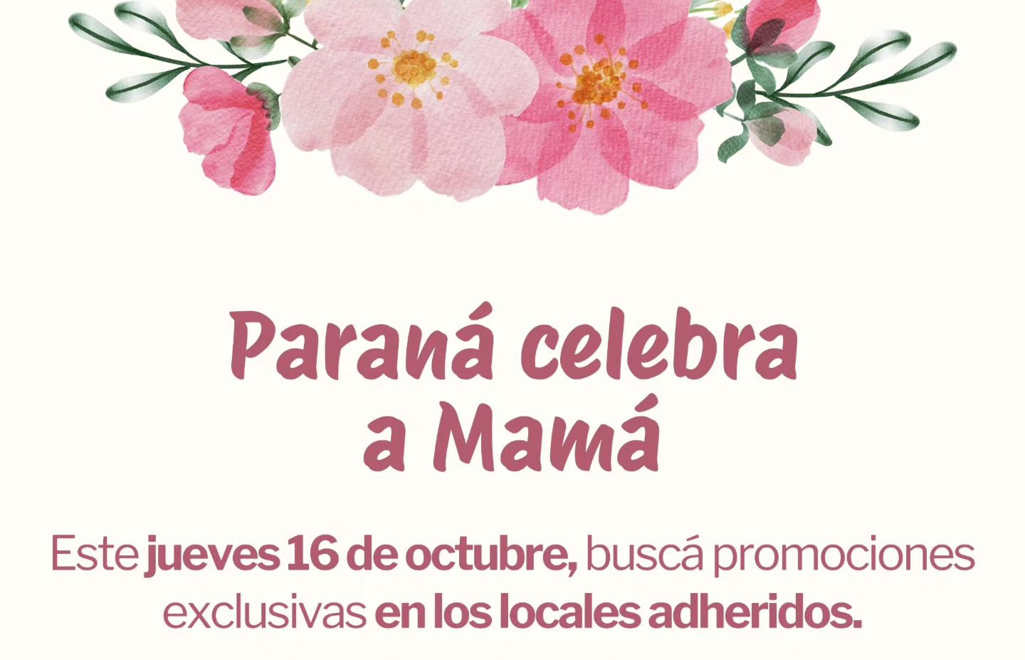 Con motivo de la celebración del Día de la Madre (domingo 19 de octubre), los comercios paranaenses se suman a la propuesta “Paraná Celebra a Mamá”. Será este jueves 16 de octubre con descuentos y promociones exclusivas en locales adheridos a la campaña. Además, habrá sorteos entre los clientes, noches de compras con horario extendido (en algunos locales), feria de emprendedores y actividades culturales en distintos puntos del micro y macro centro.