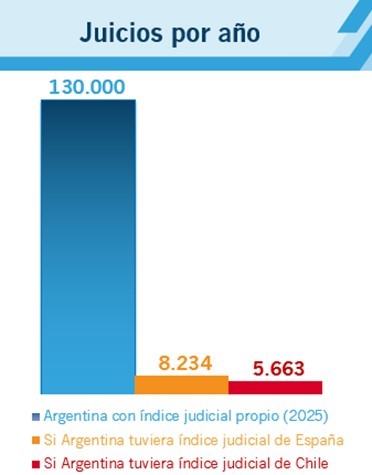 Si Argentina tuviera el índice judicial de España, tendría algo más de 8.000 juicios por año y si tuviera el índice de Chile no alcanzaría a 6.000 juicios por año. (Ver gráfico adjunto Juicios por año).