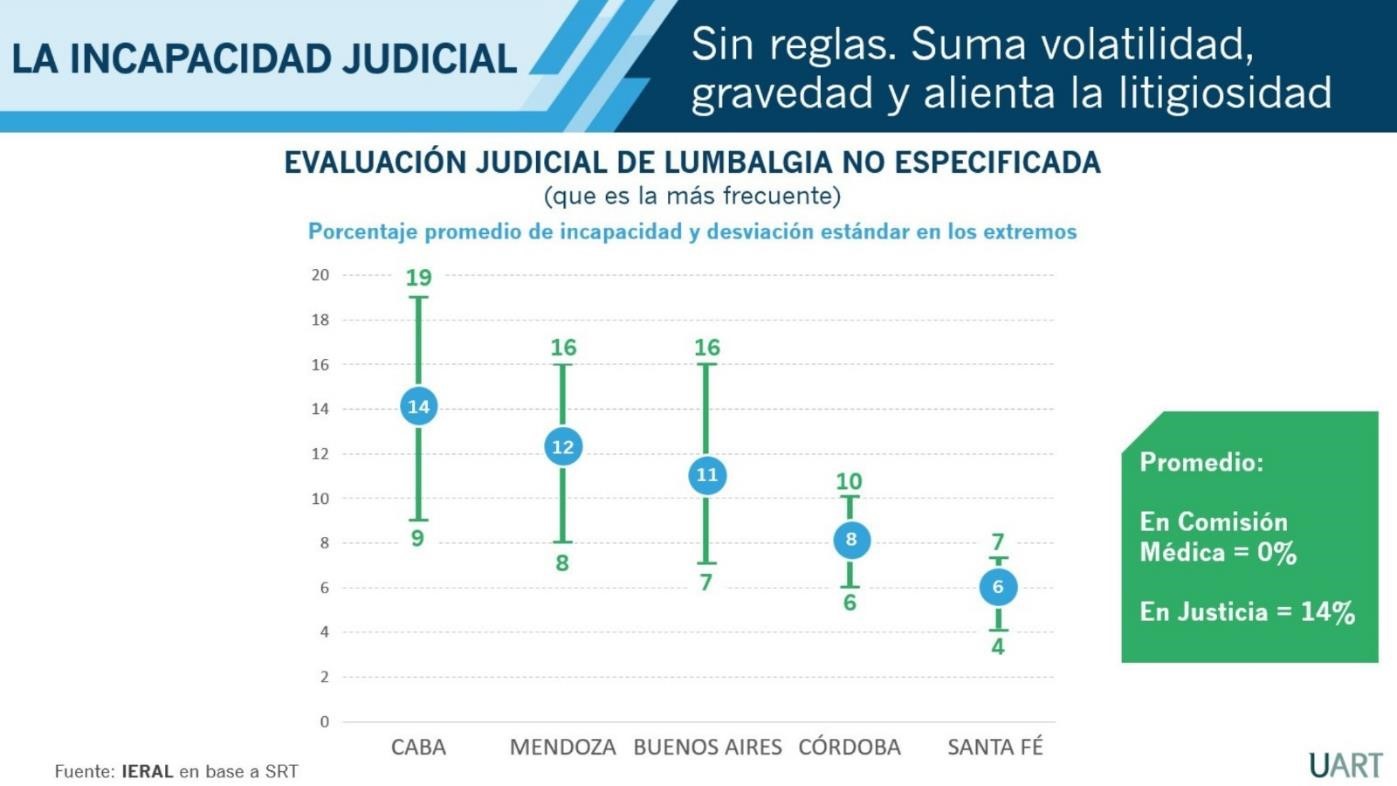 Según un informe de IERAL de Fundación Mediterránea, la lumbalgia (una de las afecciones más frecuentemente diagnosticadas en la justicia) luego de ser valoradas sin incapacidad en Comisiones Médicas, suelen promediar, según los peritos judiciales, un 14% incapacidad definitiva. Si bien ese es el promedio hay una amplia variabilidad, no sólo entre provincias sino dentro de cada jurisdicción (ver gráfico adjunto Evaluación de lumbalgia no especificada).