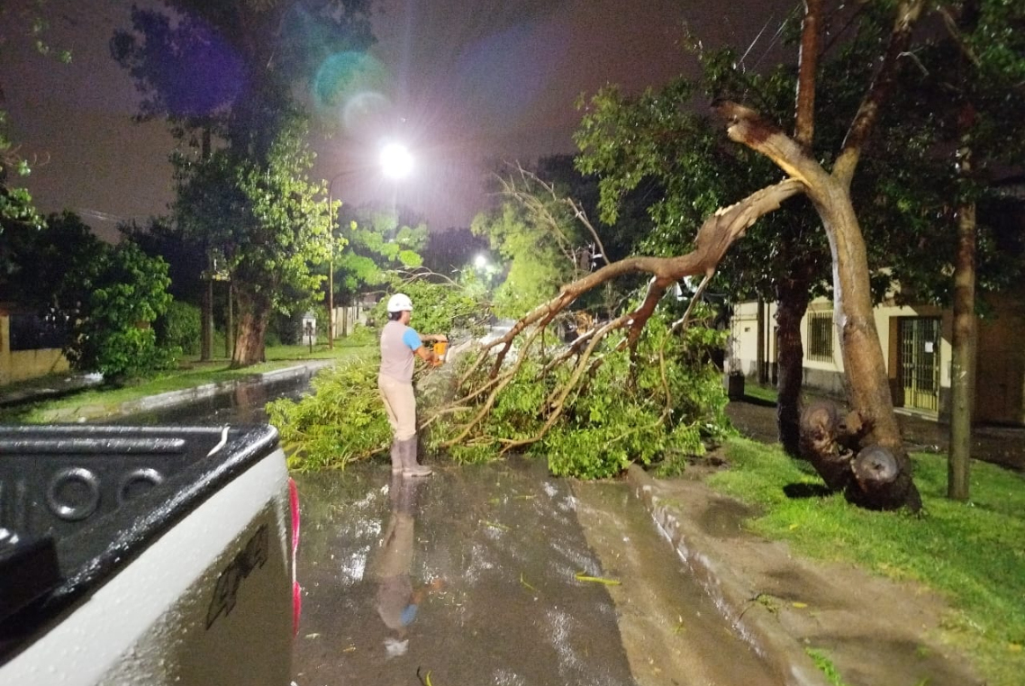 Durante la tormenta, se reportaron caídas de árboles en varios puntos de la ciudad. En calle Illia, cerca de Gualeguaychú, una rama de gran tamaño cayó sobre un vehículo, mientras que en la calle 1613, frente a la Base Aérea, un poste de electricidad y telefonía se desplomó sobre la puerta y ventana de una vivienda. Además, en la calle Larramendi, un árbol de gran porte interrumpió la circulación, y se registraron postes caídos y voladura de techos en las zonas sur y este de la ciudad.