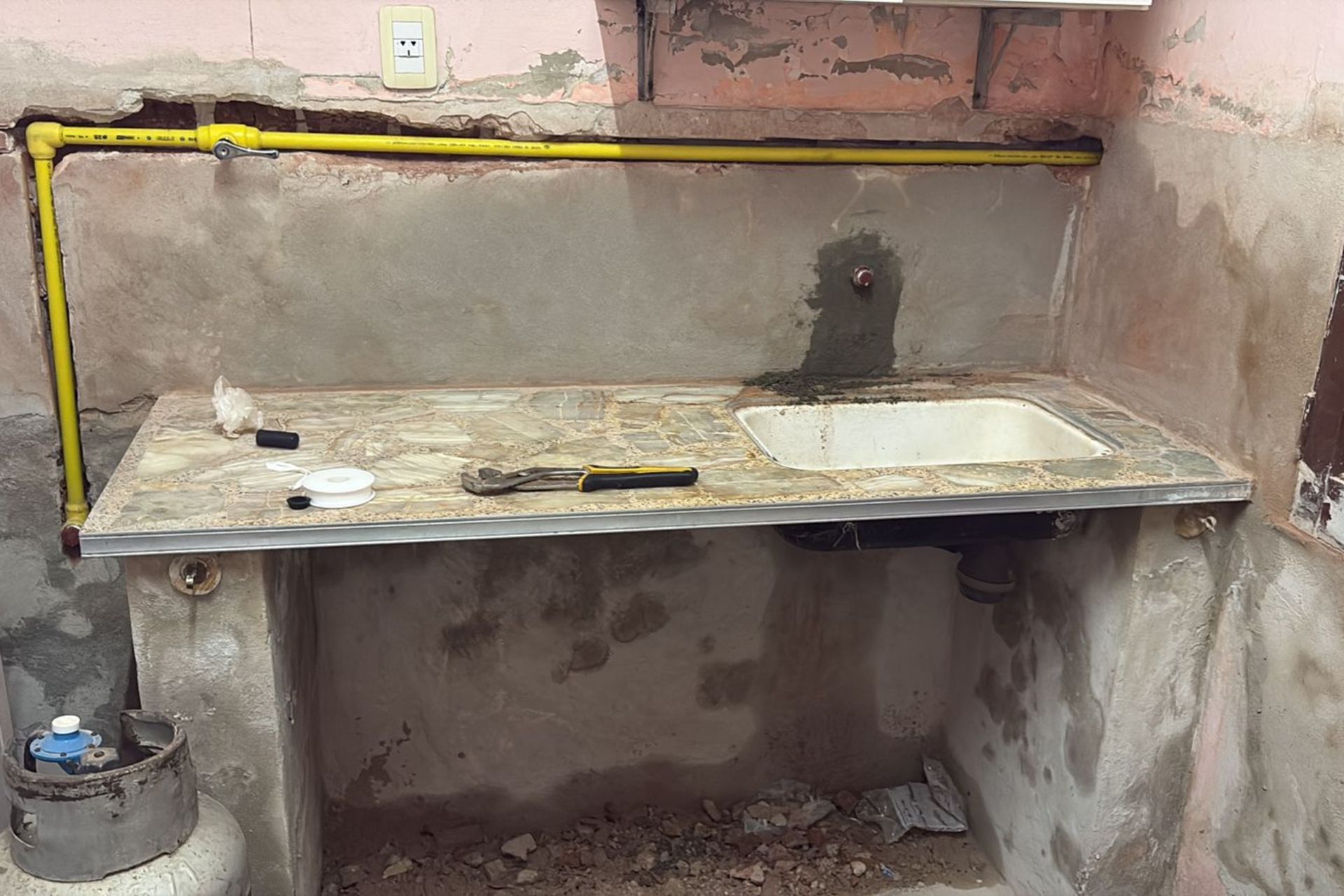 Por otro lado, en el sector de la cocina-comedor, el establecimiento presentaba la falta de una instalación de gas adecuada ya que utilizaba una garrafa de 10 kilos, lo cual representaba un riesgo. Ante esta situación, se instala una nueva cañería para gas envasado, completa y embutida, desde los artefactos hasta el tubo con gabinete incluido.
