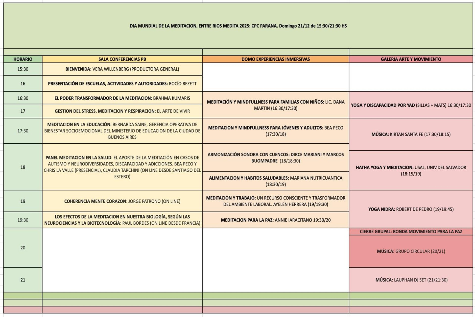 El evento por el Día Mundial de la Meditación, tendrá lugar en el Centro Provincial de Convenciones (CPC) de Paraná, el domingo 21 de diciembre de 15.30 a 21.30 hs, será con entrada libre y gratuita. A modo organizativo se recomienda realizar previamente la inscripción al siguiente link: https://www.entreriosmedita.com